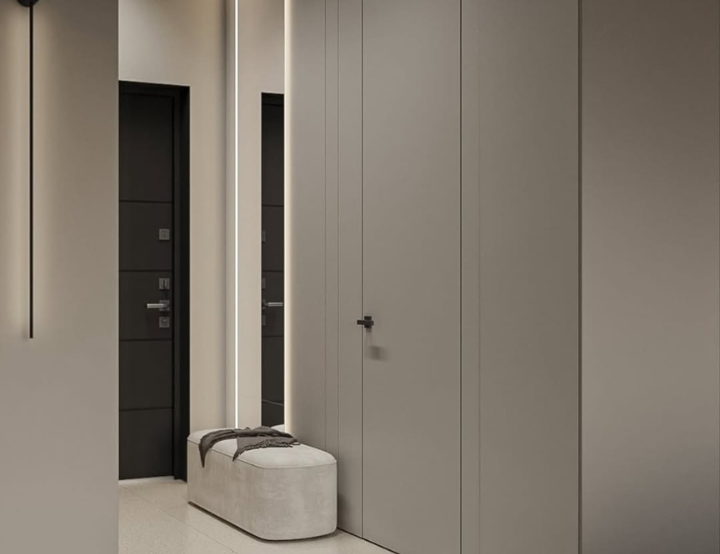 Hidex — это полноценное инженерное решение, в котором дверь становится частью стены. Короб скрывается внутри конструкции, отсутствуют наличники, а само полотно при закрывании уходит в одну плоскость со стеной. Итог — монолитная поверхность, в которой дверь практически незаметна.